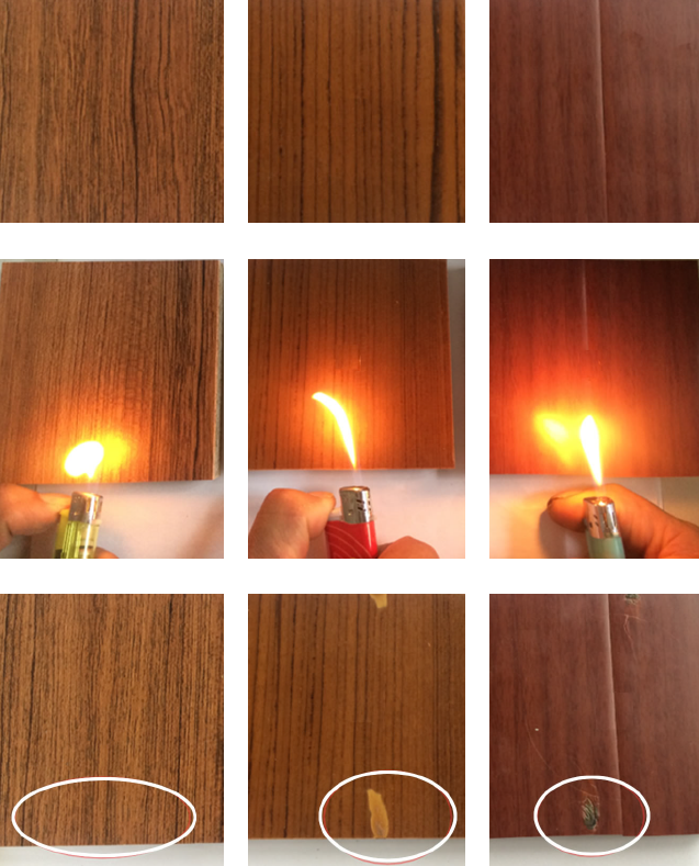 在1.5N的压力下,对 杜拉特(CPL)材质、PVC材质、油漆材质进行对比实验(转数均为2圈的表面效果)
